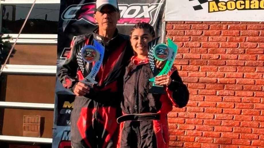 Alexia tiene 22 años, es de Lamarque y copilota de rally hace apenas unos meses. Corre junto a su papá Robinson Monsalves (58), piloto y mecánico de autos. Él invitó a su hija a ser navegante y la embarcó en una aventura que ayer los dejó en lo alto del podio.
