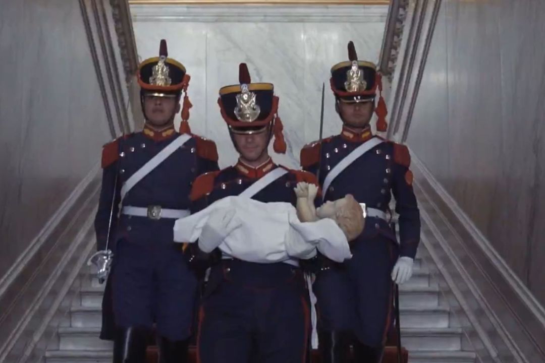 En las imágenes se observa a tres integrantes del Regimiento de Granaderos a Caballo trasladando la imagen del Niño Jesús por los pasillos y escaleras de la sede presidencial. La escena estuvo acompañada por el villancico “Noche de paz”, interpretado en un tono solemne, y culminó con la colocación del Niño en el pesebre instalado en el patio de la Casa de Gobierno.