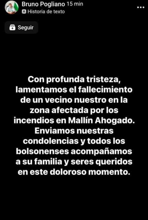 Lamentamos profundamente el fallecimiento de un vecino en la zona afectada por los incendios en El Bolsón. Acompañamos a su familia y seres queridos en este difícil momento.