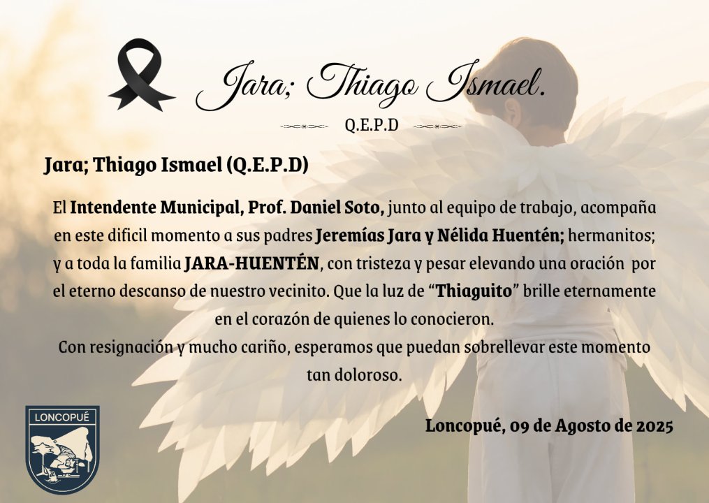 El intendente de Loncopué, Daniel Soto, confirmó la muerte del pequeño el sábado cuando emitió un comunicado para enviar mensaje de pesar a los padres quienes forman parte del equipo municipal y a toda la familia Jara Huentén. «Que la luz de Thiaguito brille eternamente en el corazón de quienes lo conocieron», expresó.