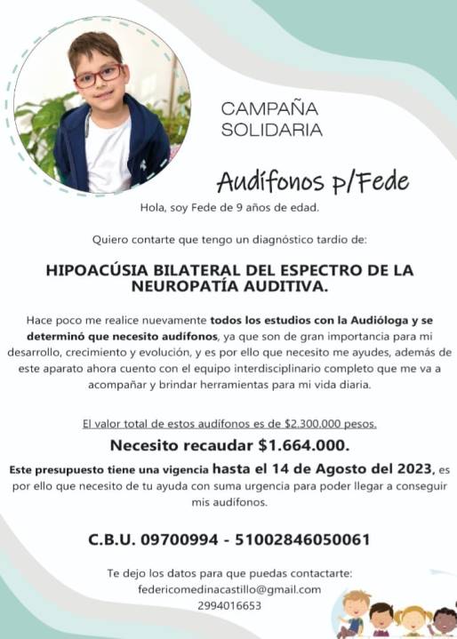 Fede tiene nueve años y tiene un diagnóstico tardío de «hipoacusia bilateral». Tras idas y vueltas con médicos en Bahía Blanca y Neuquén, le informaron que requiere audífonos, y al mismo tiempo, su familia no descarta que necesite una cirugía en el futuro, ya que podría tener otra patología. Por esto, recaudan dinero para pagar el dispositivo que requiere una suma de más de un millón y medio de pesos.