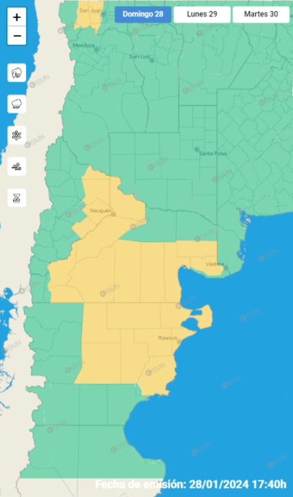 En Río Negro, se encuentraban bajo advertencia los departamentos General Roca, El Cuy, Conesa, Adolfo Alsina, San Antonio, y Valcheta. También Pilcaniyeu, Ñorquincó, Nueve de Julio y Veinticinco de Mayo.