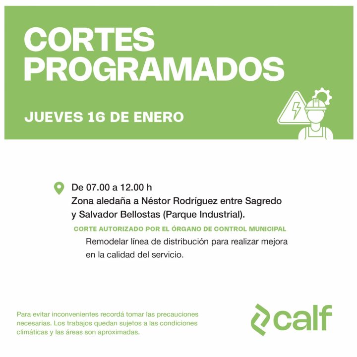Desde la Cooperativa de energía CALF anunciaron que habrá corte de luz programado para la ciudad de Neuquén. Será este jueves 16 de enero, a una semana del apagón eléctrico que sufrió la capital por más de siete horas. Conoce los detalles.