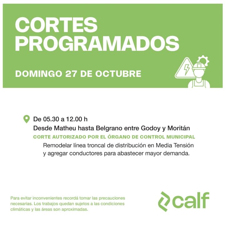 El corte de luz programado, por la Cooperativa Calf, serán en calles principales del centro de la ciudad. Comenzarán a las 5:30 y finalizarán cerda de las 12, por lo que durará aproximadamente seis horas.