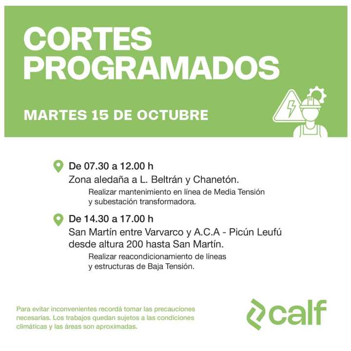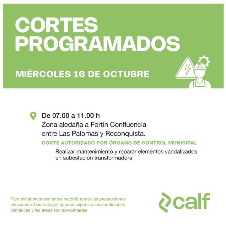 Calf anunció cortes de luz para este martes 15 y miércoles 16 de octubre, en Neuquén. Será desde las 7:30 hasta la tarde por diferentes tareas.