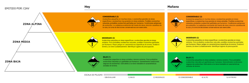 Desde el CIAV, compartieron que para este viernes, «se estima que el peligro de avalanchas en zona alpina sea considerable, en zona media sea moderado y en zona baja sea Bajo. La confianza en esta estimación para mañana se considera baja».