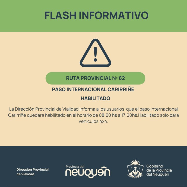 Sin embargo, el camino no está apto para todo vehículos, ya que la Ruta 62 es toda de ripio y además cuenta con muchos pozos y barro. Por este motivo, desde la Dirección Provincial de Vialidad recuerdan que en el paso Carirriñe sólo está permitido cruzar con vehículos 4×4.