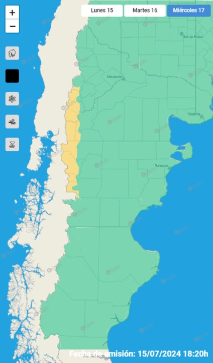 En el caso de Río Negro, la alerta amarilla es para el departamento Bariloche y parte de Ñorquinco y Pilcaniyeu. Incluye a ciudades como El Bolsón, Bariloche, Dina Huapi y Pilcaniyeu. El horario de las precipitaciones intensas también será durante la tarde del miércoles.