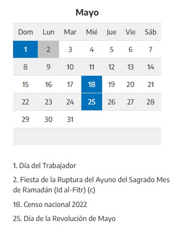 Por su parte, la semana siguiente también habrá un feriado y también será un miércoles. Se trata del 25 de mayo, día en el que se celebra el primer paso transicional de gobierno argentino.