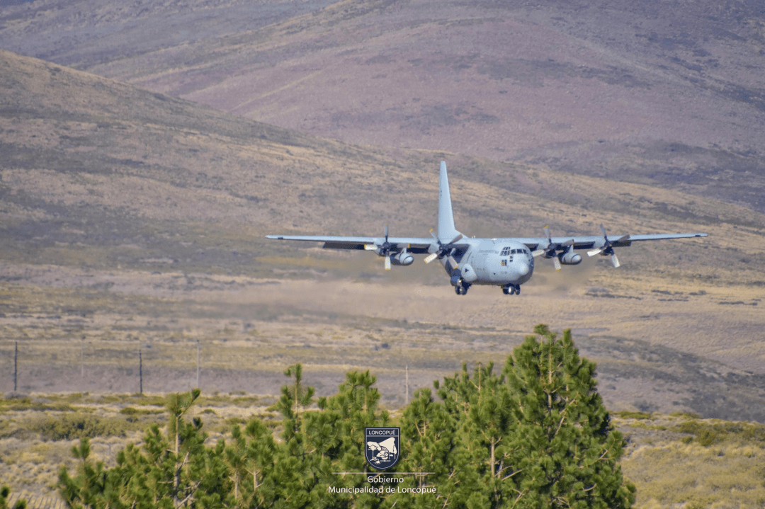 El avión Hércules de la Fuerza Aérea ya está en Loncopué. Su llegada se concretó en el mediodía de este jueves.