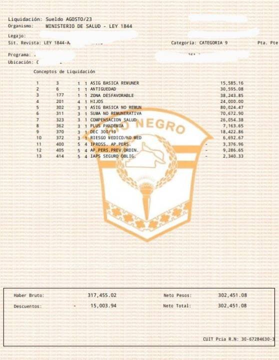 Un empleado administrativo de salud Ley 1844 con la misma antigüedad, 20 años, cobró 302.000 pesos de salario, según los recibos que difundieron de trabajadores de Asspur.