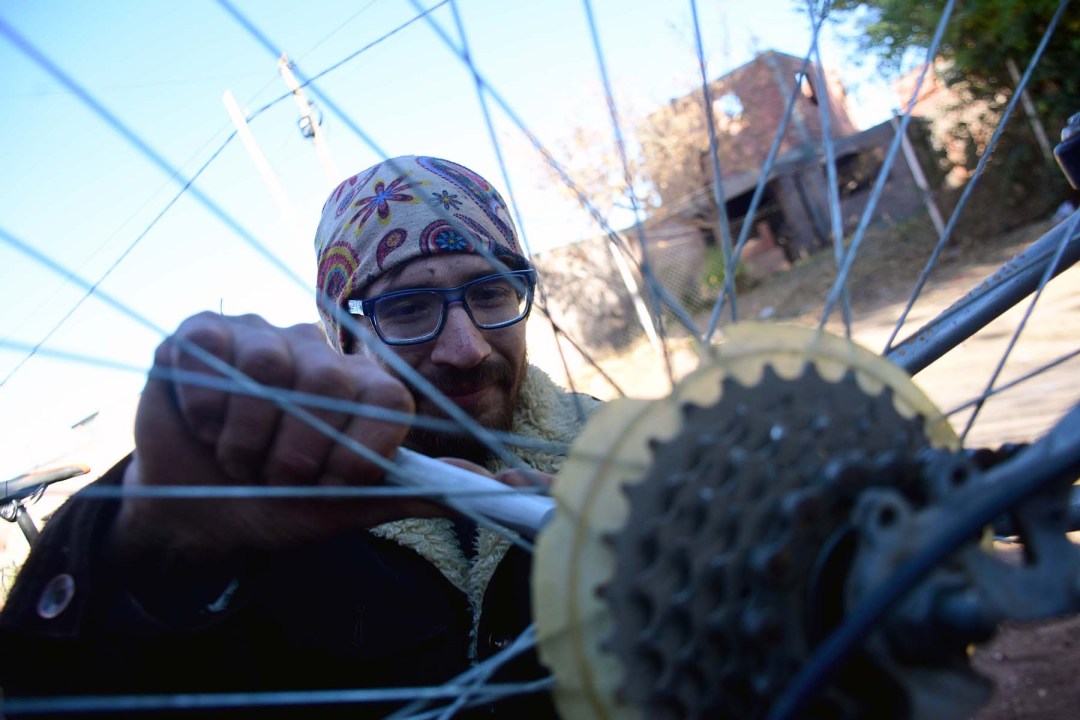 Nunca trabajó en una bicicleteria. Pero, un día empezó a reparar los rodados de sus vecinos. De gusto y por solidario. Algunos le acercaron un cuadro, después una rueda. Otros una bicicleta en desuso, palancas o frenos. Publicó en redes sociales y de a poco, fue armando un stock. “Uno me dijo, armala y después la vendes”, cuenta, “pero yo no quiero, esto es por solidaridad, para ayudar a otros. Se armó una red hermosa de personas”.