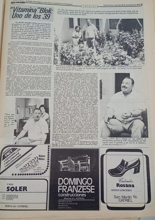 “No nos vamos más de acá”, recuerdan que dijo Vital Raúl Cecilio Blok, jefe de perforadores, al ver que surgía petróleo del pozo Catriel Oeste I, el 20 de noviembre de 1959. Había llegado hasta allí seis meses antes, con 44 años, junto a otra docena de compañeros, incluido el cocinero, que se encargó de preparar un asado en el campamento para sortear el hambre del arribo a última hora.