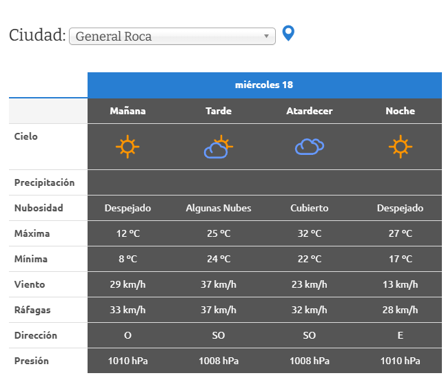 En Roca, el clima se presenta variable, con calor y viento como protagonistas. La mañana comenzará con cielos despejados y temperaturas frescas, alcanzando los 12°C. Sin embargo, a medida que avance el día la jornada, el calor irá en aumento, con temperaturas que alcanzarán los 32°C hacia la tarde, las rafágas de viento alcanzarán los 37 km/h.