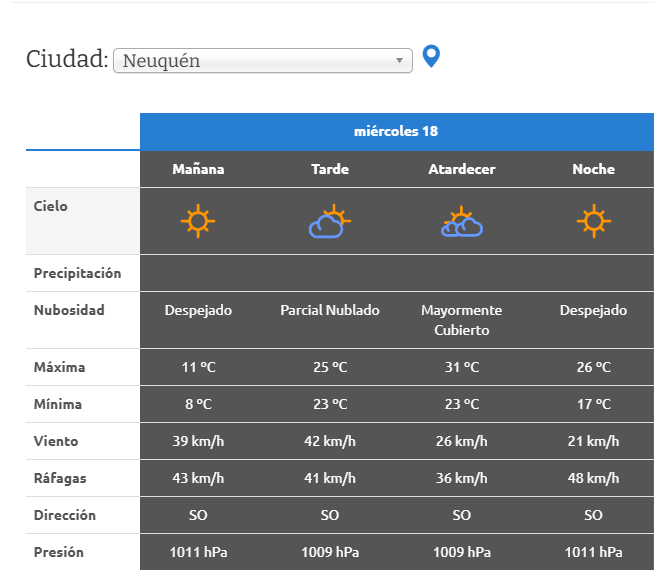 En Neuquén, la jornada comenzará con cielo despejado y temperaturas en ascenso desde los 11°C por la mañana hasta alcanzar los 31°C al mediodía. Sin embargo, el viento sur será un factor a considerar, con velocidades sostenidas de 39 km/h y ráfagas que podrían superar los 48 km/h, haciendo que la sensación térmica sea más incómoda.