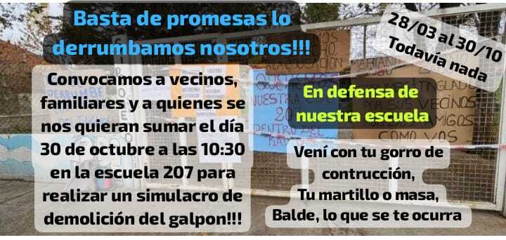 Un incendio, en marzo de este año, en un galpón del banco Galicia dejó a la escuela 207 de Neuquén sin un edificio propio. Un grupo de padres, vecinos y miembros de la comunidad harán un simulacro de demolición este miércoles a modo de protesta. Piden una solución concreta a siete meses del hecho. De manera transitoria la comunidad educativa asiste en el Centro Recreativo Nayahue.