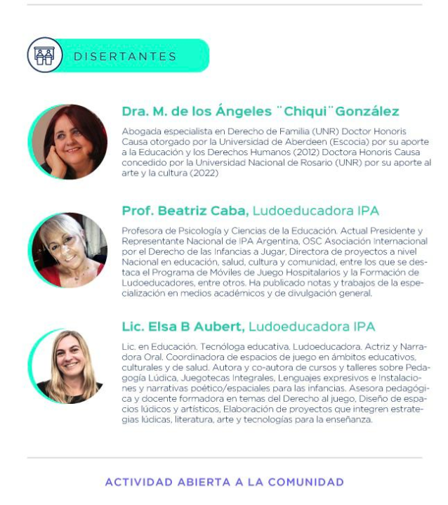 Con respecto a los objetivos de las jornadas, comentaron que se busca: profundizar la temática del juego y el jugar de las infancias a partir de una conferencia a cargo de una especialista de excelencia profesional. Realizar diagnóstico y seguimiento de los proyectos presentados por los y las Ludoeducadores en la formación 2022 e implementados, para fortalecerlos con un asesoramiento en las instituciones; y dar continuidad a la formación integral con una actualización que amplié el repertorio de conocimientos y recursos trabajados, «sumando las resonancias de la conferencia de Chicu González en una modalidad lúdico pedagógica integral para los participantes», aseguraron.