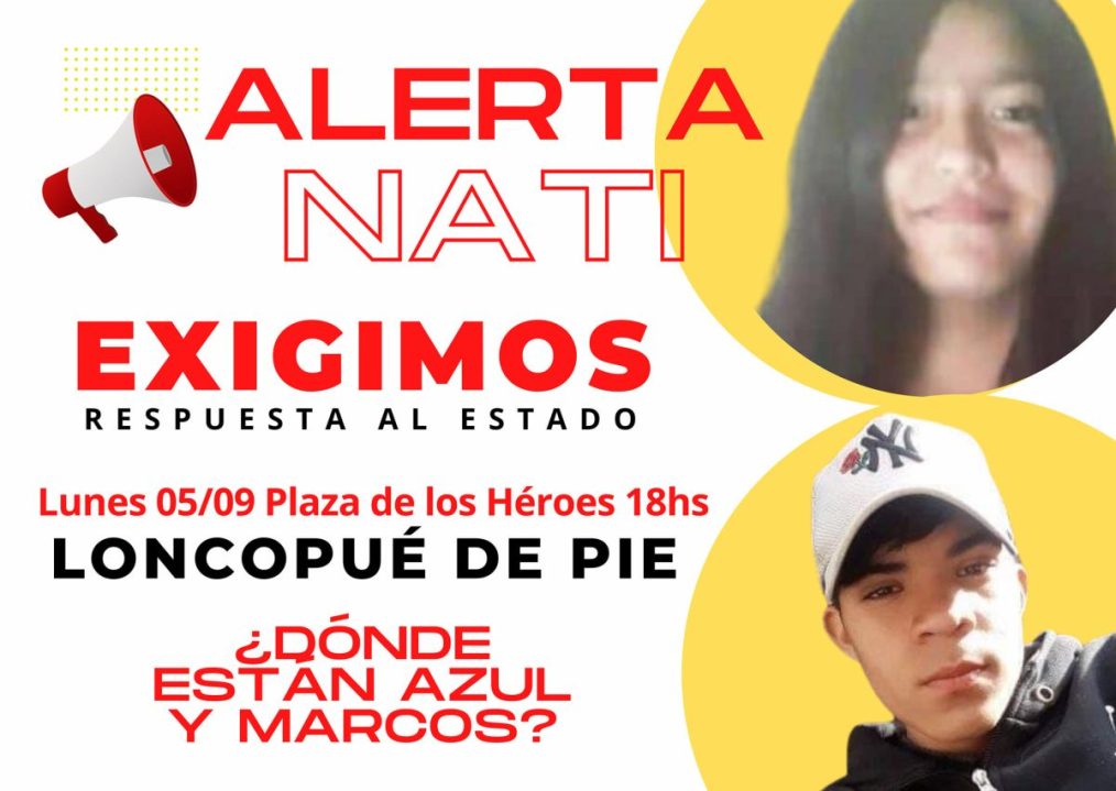 Almendra es integrante de Koñol Piuke, una agrupación feminista de Loncopué. Fueron quienes se hicieron eco de la desesperación de las familias, que no entienden cómo aún no hay ninguna pista sobre los adolescentes. Lo último que se supo de ellos es que se fueron de sus casas el jueves, por la mañana, y que una cámara de seguridad los filmó saliendo del pueblo, como para hacer dedo en la ruta. Ninguno de los dos llevaba documentación ni sus pertenencias.