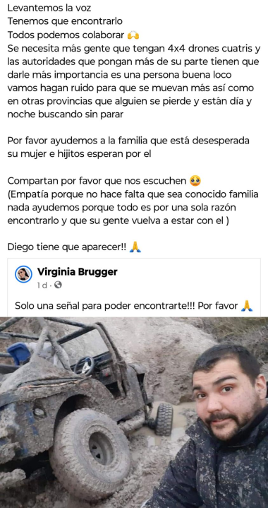 Luego Virginia, le agradeció a quienes siguen buscando a su marido: «Gracias a todos los que están ayudando en la búsqueda de Diego y rezando por él. Todos estamos rogando para que aparezca pronto, no dejen de pedir por él, no perdamos la fe. No lo dejen solo, tráiganme a Diego«.