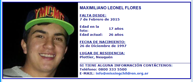 El otro caso es el de Maximiliano Flores, un joven que al momento de su desaparición tenía 17 y vivía en Plottier. “En 2015 Maximiliano se fue supuestamente a Mar del Plata con una persona mayor que él”, cuenta María de los Ángeles, “pero cuando vuelve esta persona, vuelve sin él. Su mamá recorrió cielo y tierra y nunca lo encontramos. Lo seguimos buscando”.
