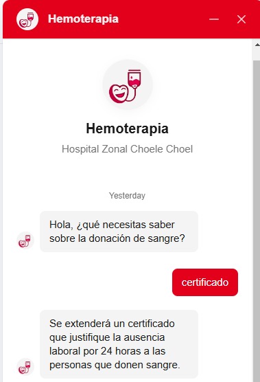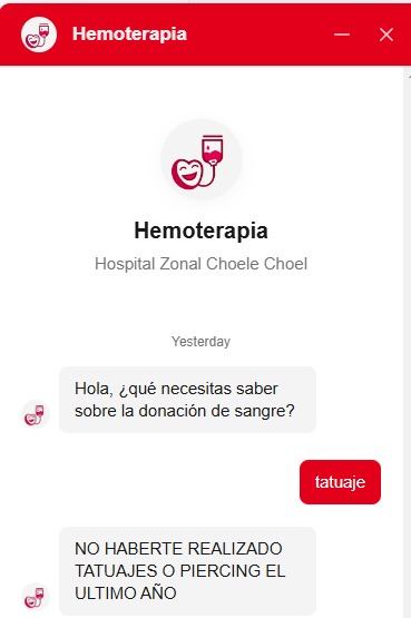 Además la aplicación tiene un chatbot con inteligencia artificial, desde el cual se pueden obtener respuestas a dudas de los donantes. Por ejemplo: se le puede consultar: la cantidad de veces que se puede donar por año, el peso mínimo que hay que tener, la edad, enfermedades, tatuajes, etc.