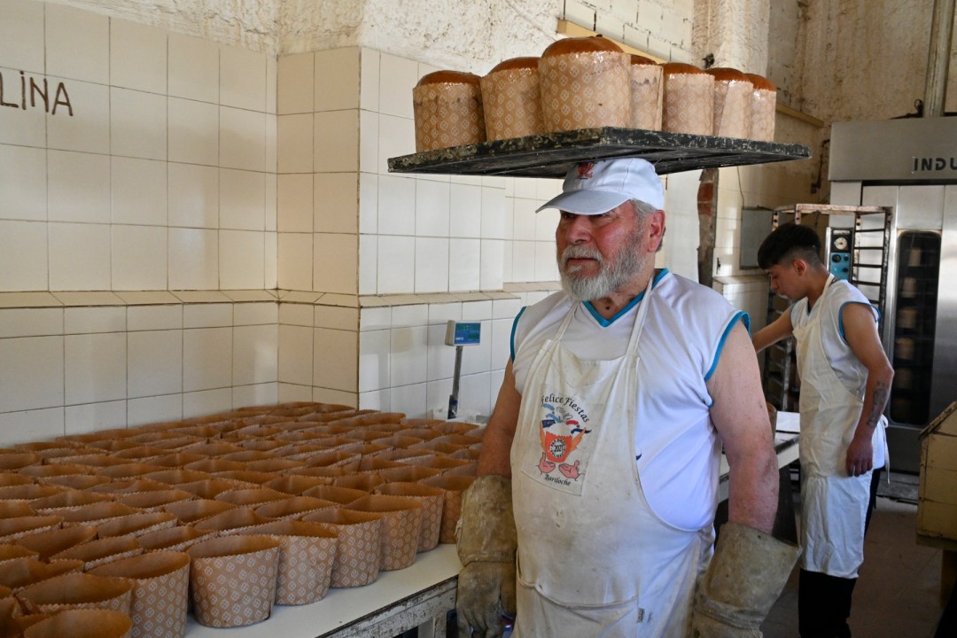 La máquina está programada para amasar la mezcla de lo que serán 120 pan dulces. Un joven dispone los moldes vacíos en un marmol, mientras Nicolás coloca en una bandeja aquellos que ya salieron del horno rotativo y están listos. De pronto la amasadora se detiene, la mezcla cruda es dividida en decenas de bollitos que Nicolás azota, uno a uno, contra el marmol y termina de redondearlos. Les pone la fruta y los coloca en el molde para pintar la parte superior con huevo y llevarlos al horno. Este proceso se repite varias veces al día desde el último fin de semana y hasta los días previos a la Navidad.