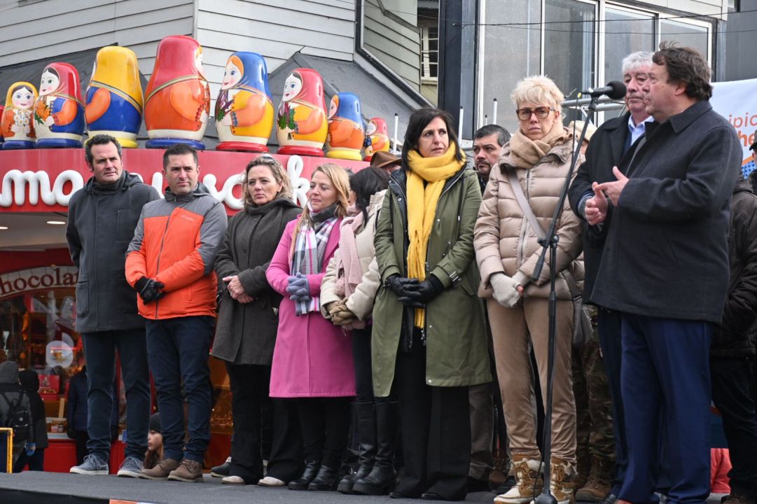 El acto por el cumpleaños de Bariloche se inició poco después de las 10 de este viernes. El palco estuvo emplazado en la esquina de Rolando y Mitre y después de los discursos comenzó el desfile, con público menguado respecto de ediciones anteriores, debido al viento helado y el clima invernal.