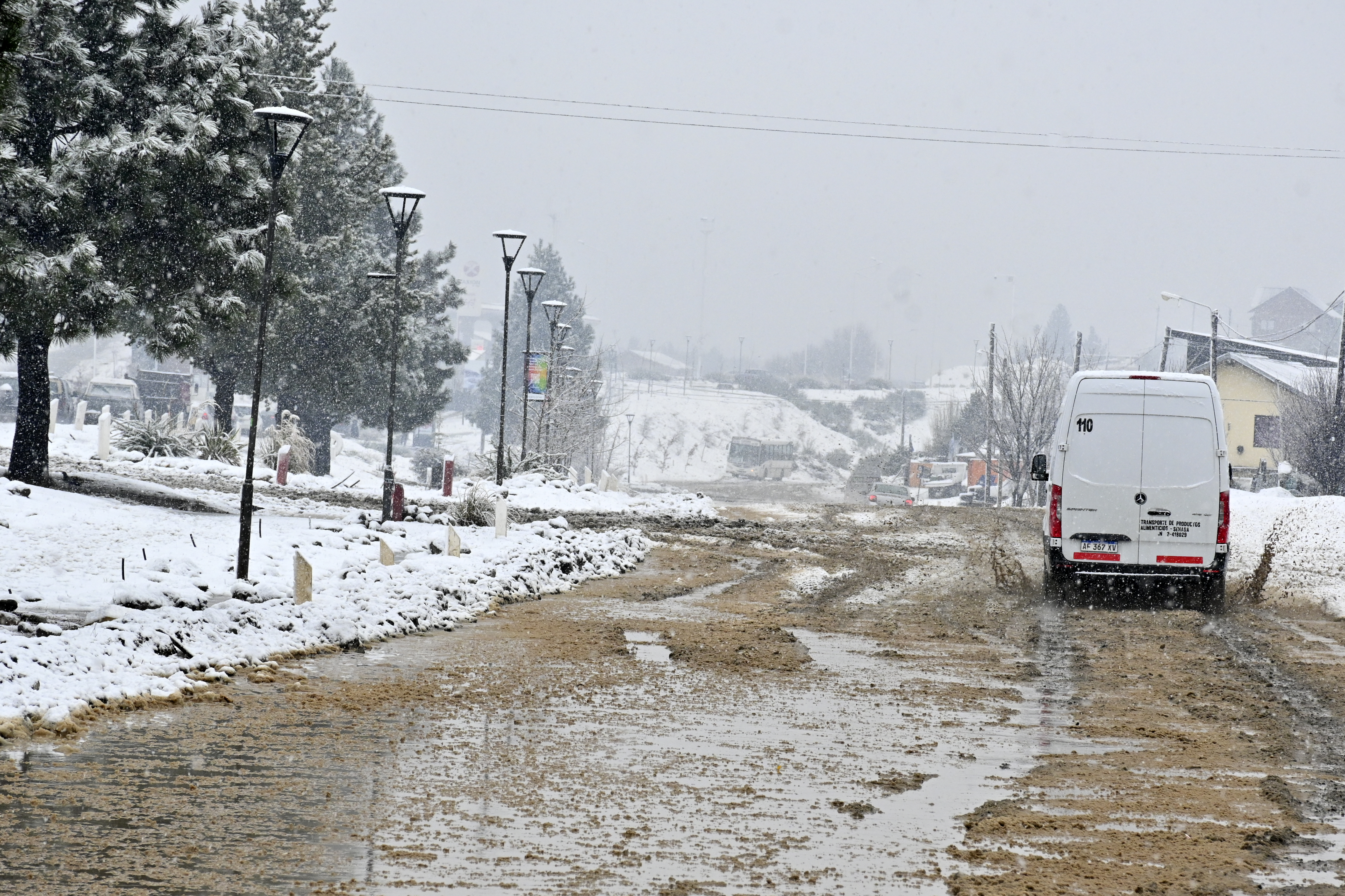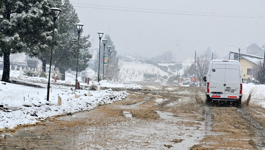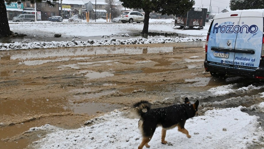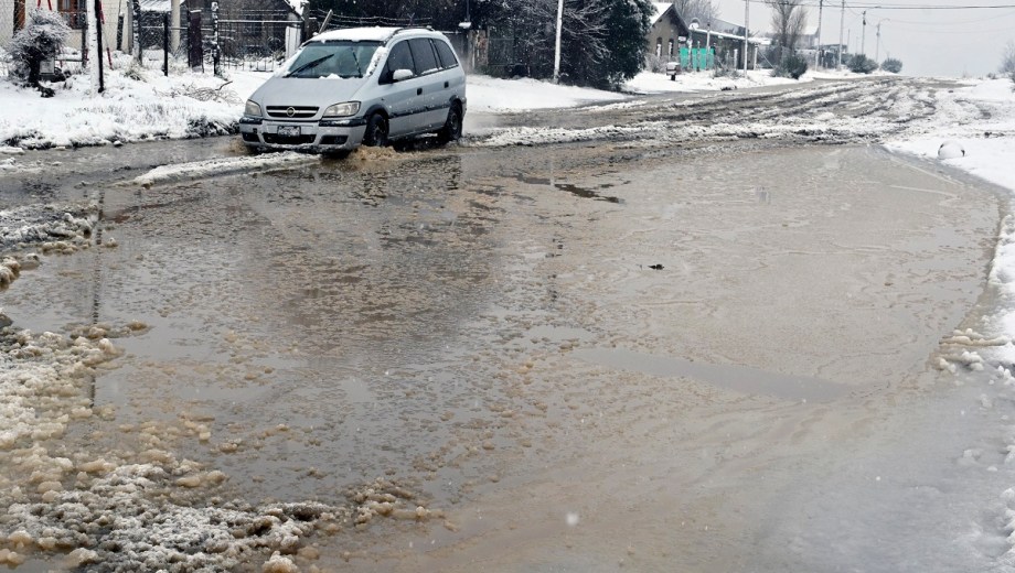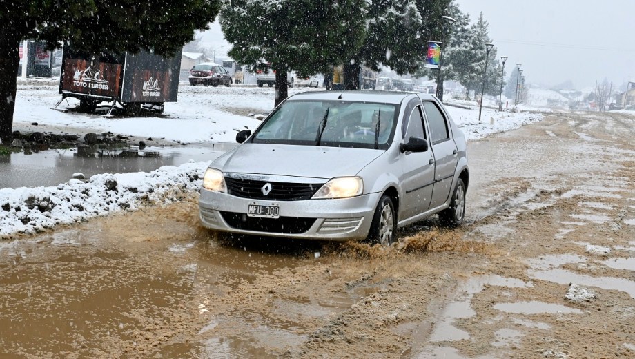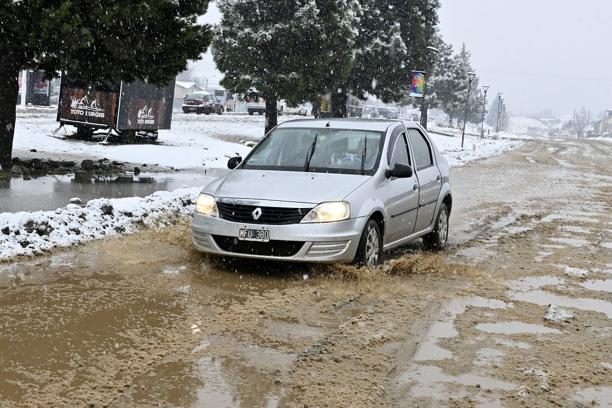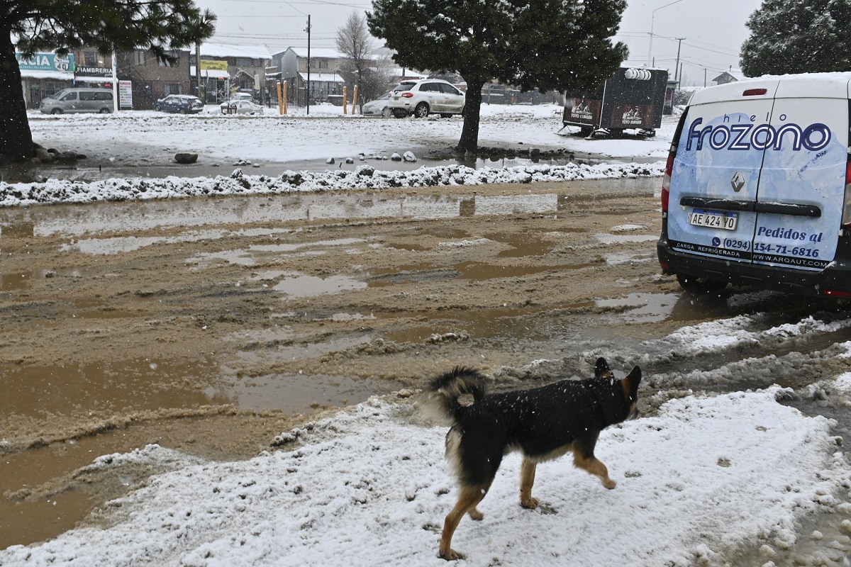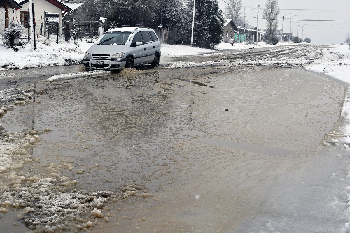Las lagunas de agua que formó la lluvia en algunos barrios al sur de Bariloche se taparon de nieve en las últimas horas. Autos circulando lentamente para esquivar los pozos, personas atestadas en las garitas del colectivo y semáforos intermitentes formaron parte de la postal este miércoles por la mañana.