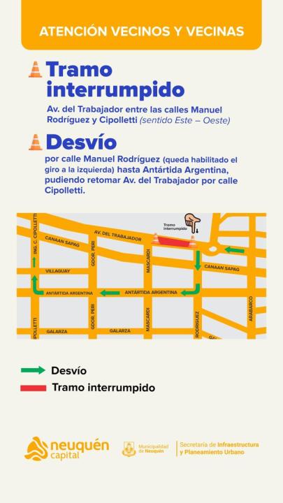 La Municipalidad de Neuquén está realizando obras en el cruce de la Avenida del Trabajador y Manuel Rodríguez, una zona del oeste altamente transitada. Por los trabajos hay un desvío sobre la Avenida, en el sentido este-oeste, que se mantendrá hasta el próximo lunes.