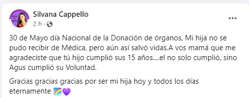 Hoy, en el Día Nacional de la Donación de Órganos, que promueve la concientización de ser donante, Silvana Capello compartió una publicación en Facebook reflexionando sobre el acto de donar. Después de darse a conocer la muerte de Agustina Fernández, la familia decidió donar los órganos de la joven, ya que su voluntad era ser donante.