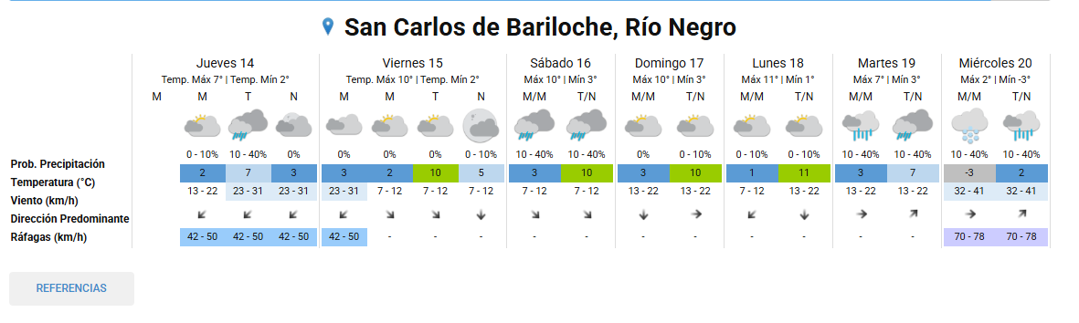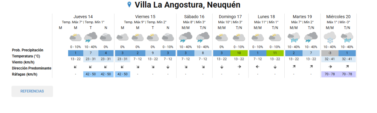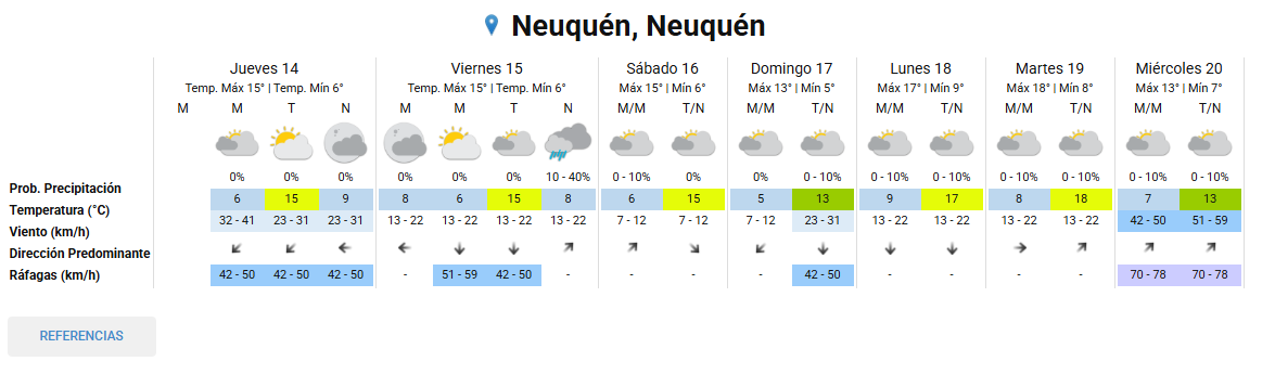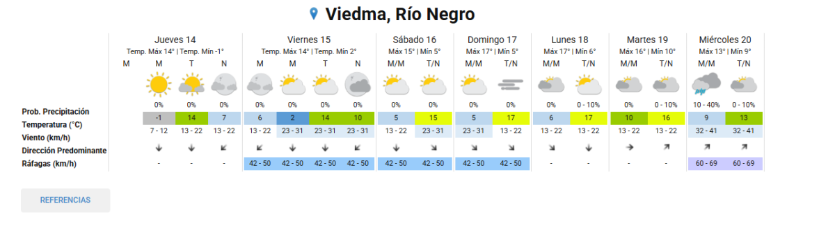 El viernes 15 se presentará con cielo mayormente cubierto a lo largo del día, aunque no hay probabilidad de lluvias. Las temperaturas irán desde los 2 °C de mínima a los 14 °C de máxima. El viento será moderado con ráfagas de hasta 50 km/h, especialmente en horas de la tarde y la noche.