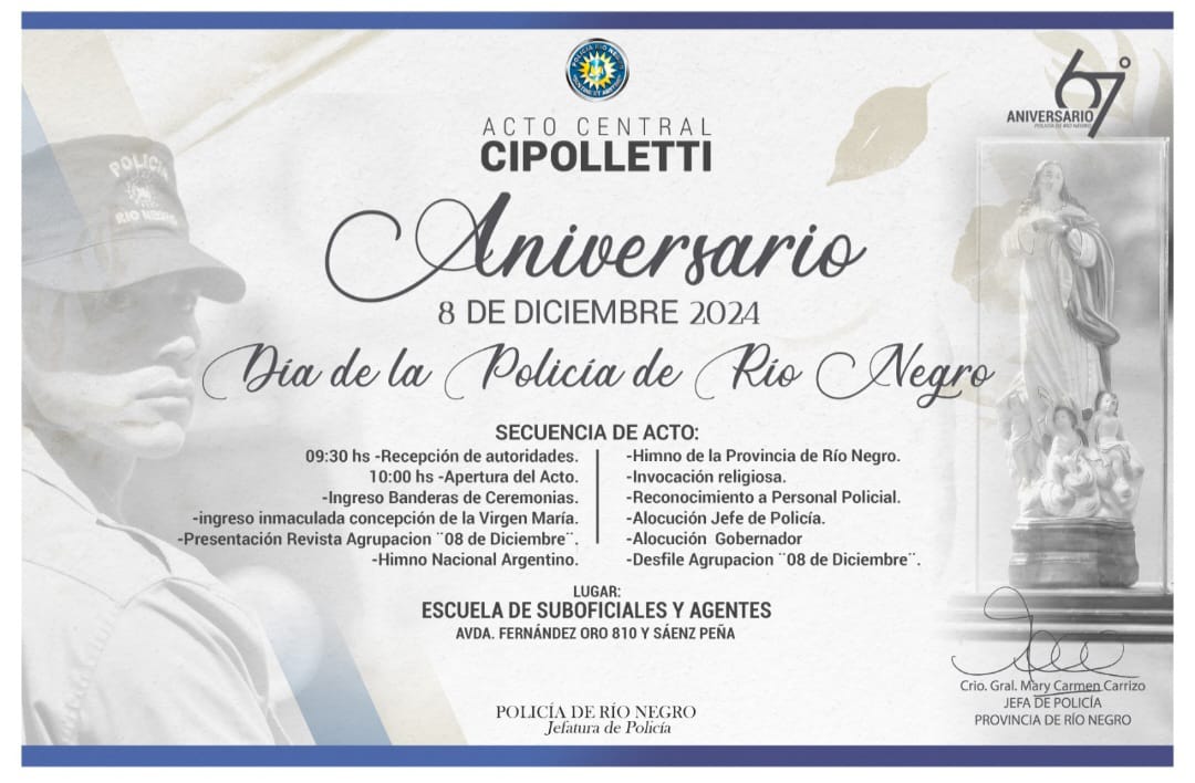 Este domingo 8 de diciembre en Cipolletti se realizará un acto por el aniversario del Día de la Policía de Río Negro. Será en pleno centro de la ciudad. Habrá un desfile y entrega de reconocimientos.