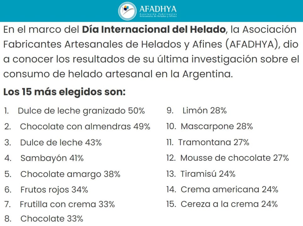 En el marco de los festejos, la Asociación Fabricantes Artesanales de Helados y Afines (AFADHYA), dio a conocer los resultados de su última investigación sobre el consumo de helado artesanal en el país.