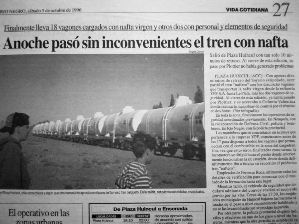 04 de octubre de 1996: Partió el tren “naftero” con 18 vagones que transportaban la nafta virgen desde la refinería YPF SA de Plaza Huincul hasta La Plata, más los dos vagones de seguridad.