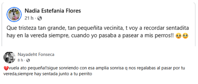 Por su parte, los vecinos de Mía la recordaron por su presencia en el barrio. «Que tristeza tan grande, tan pequeñita vecinita. Te voy a recordar sentadita ahí en la vereda siempre, cuando yo pasaba a pasear a mis perros!!», recordó Nadia.