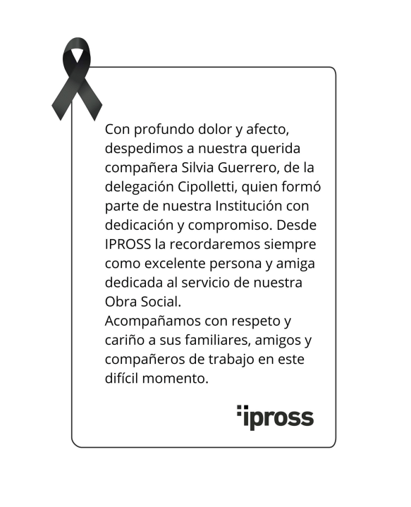 Desde el Instituto Provincial del Seguro de Salud (Ipross), también expresaron sus condolencias mediante un comunicado: «Con profundo dolor y afecto, despedimos a nuestra querida compañera Silvia Guerrero, de la delegación de Cipolletti, quien formó parte de nuestra institución con dedicación y compromiso. Desde Ipross la recordaremos siempre como excelente persona y amiga, dedicada al servicio de nuestra obra social», señalaron en un mensaje.
