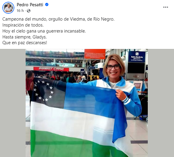El vicegobernador de Río Negro y presidente de la Legislatura, Pedro Pesatti, fue uno de los funcionarios que se expresó al respecto y lamentó lo ocurrido: «Campeona del mundo, orgullo de Viedma, de Río Negro. Inspiración de todos. Hoy el cielo gana una guerrera incansable. Hasta siempre, Gladys. Que en paz descanses!».