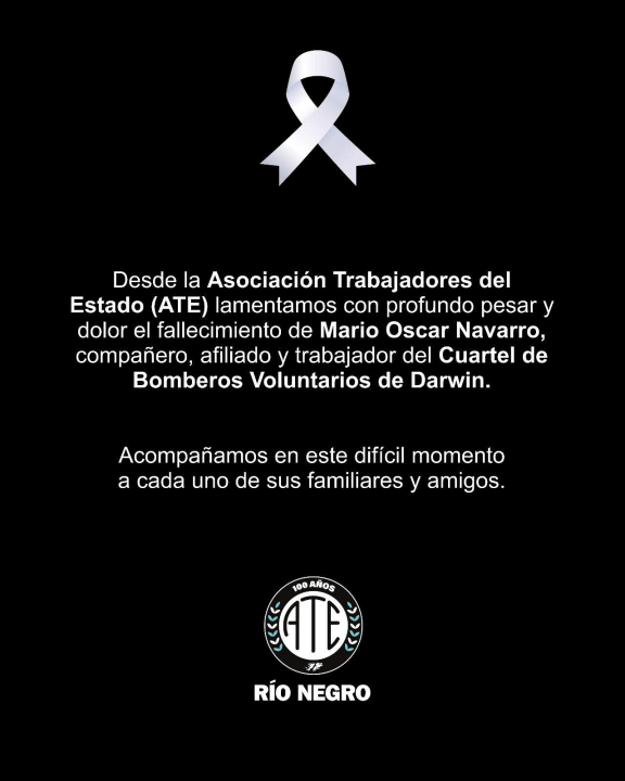 Desde la Asociación de Trabajadores Estatales (ATE) confirmaron que Navarro era afiliado y trabajador del cuartel de Bomberos Voluntarios de Darwin. «Acompañamos en este difícil momento a cada uno de sus familiares y amigos»,lamentaron.