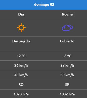 Por la noche la mínima será de -2°C, y el viento provendrá desde el sudeste, pero con la misma velocidad que durante la tarde.