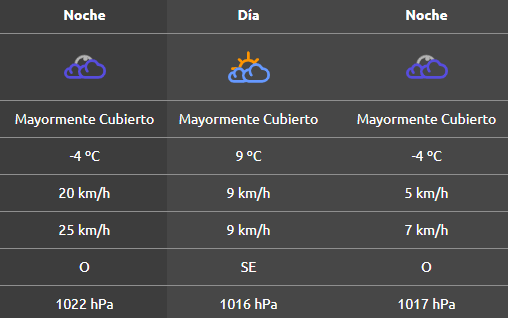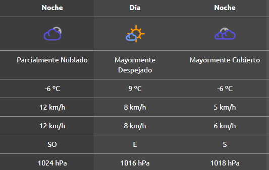 Por la noche, la mínima volverá a ser de -6°°C y el cielo estará mayormente cubierto, pero sin probabilidad de precipitaciones.
