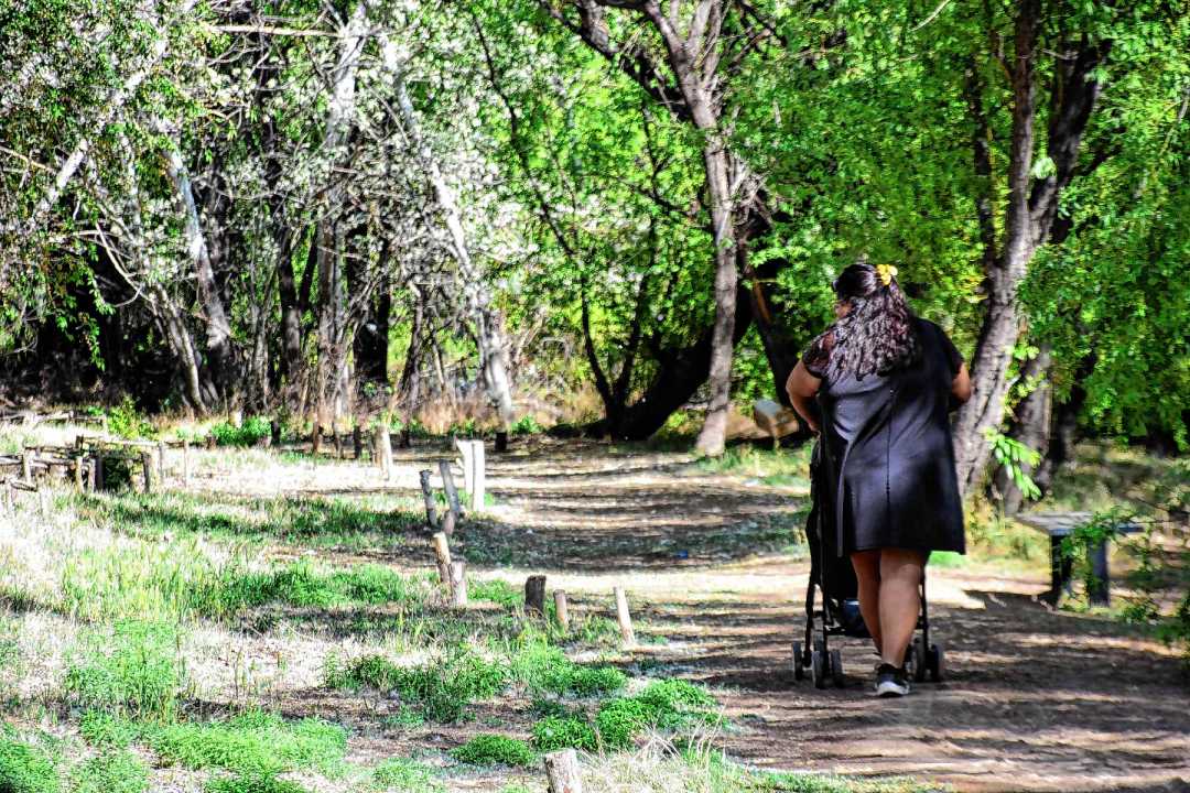 De fondo se ve agua. Es la laguna Elena, un antiguo brazo del río Limay, que se alimenta subterráneamente. Si se tiene paciencia se pueden ver cisnes de cuello negro, gallaretas o macá pico grueso. Hay 80 especies que recorren el Botánico.