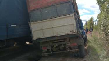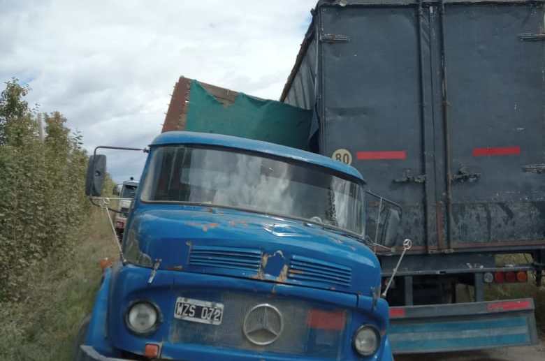 Dos camiones quedaron encajados en una calle rural en Cervantes tras intentar esquivar el corte sobre Ruta 22 que están realizando los policías retirados de Río Negro.