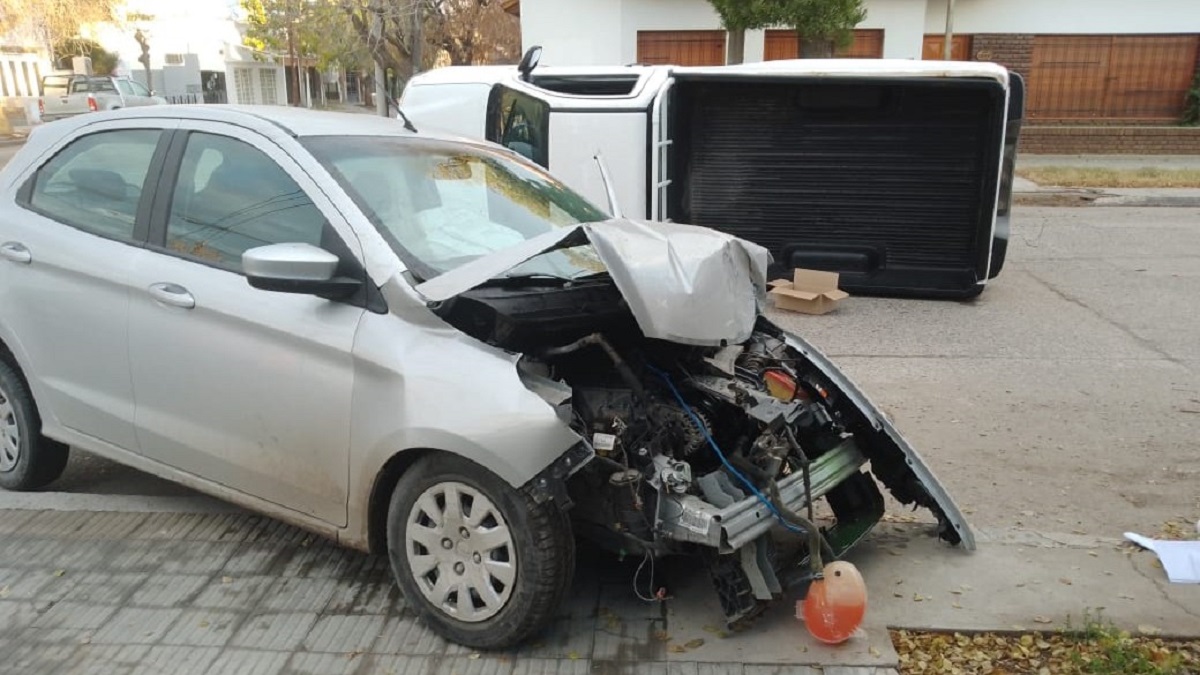 Como consecuencia del violento choque, la camioneta volcó y el automóvil quedó prácticamente destruido. Afortunadamente, solo hubo daños materiales sin heridos graves. Agentes de la municipalidad de Roca trabajan en el lugar.