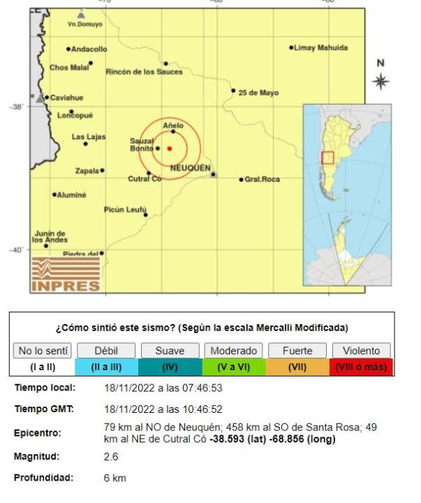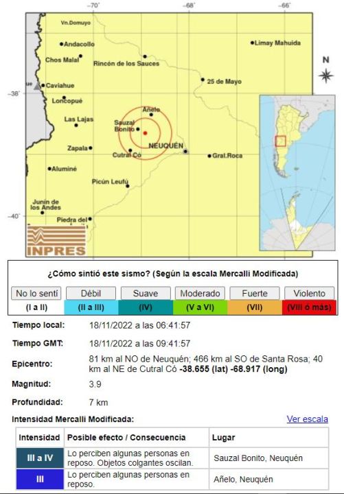 Según reportó el Instituto Nacional de Prevención Sísmica (Inpres), el primer evento telúrico ocurrió hoy a las 06:41 y fue de 3.9 en la escala de medición sísimica. El epicentro se localizó a 81 kilómetros al noroeste de Neuquén y 40 km al noreste de Cutral Co. Ocurrió a 7 kilómetros de profundidad.
