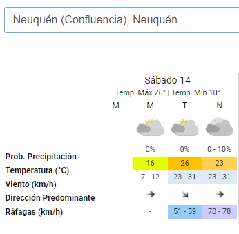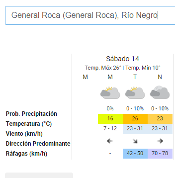- Tarde: Máxima de 26°C. El viento del Sudeste se sentirá con ráfagas más fuertes que en Roca, llegando a los 51-59 km/h.
