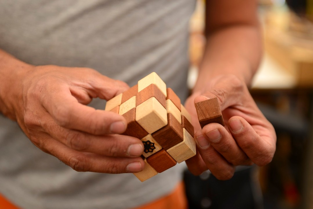 La fabricación de los juegos puede demorar varias horas cada uno. “Al cubo serpiente, por ejemplo, hay que lijarle 12 veces las piezas y lleva 27 cubos individuales”, acota Nicolás al exhibir el producto que tiene más salida en la feria y que no solo se trata de un cubo de encastre, sino que se estira como una serpiente y tiene 9 opciones de solución.