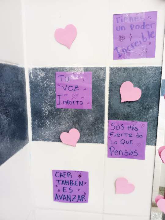 "Ponete feliz, que linda ya sos", "Tu voz importa", "Tienes un poder increíble", "Caer también es avanzar", "Sos más fuerte de lo que pensás". Mientras en muchas escuelas del país se replican amenazas de tiroteos en las paredes de los baños, en los baños de un colegio de Ingeniero Jacobacci se difundieron imágenes de carteles con mensajes alentadores y estimulantes, rodeados de corazones de cartulina.