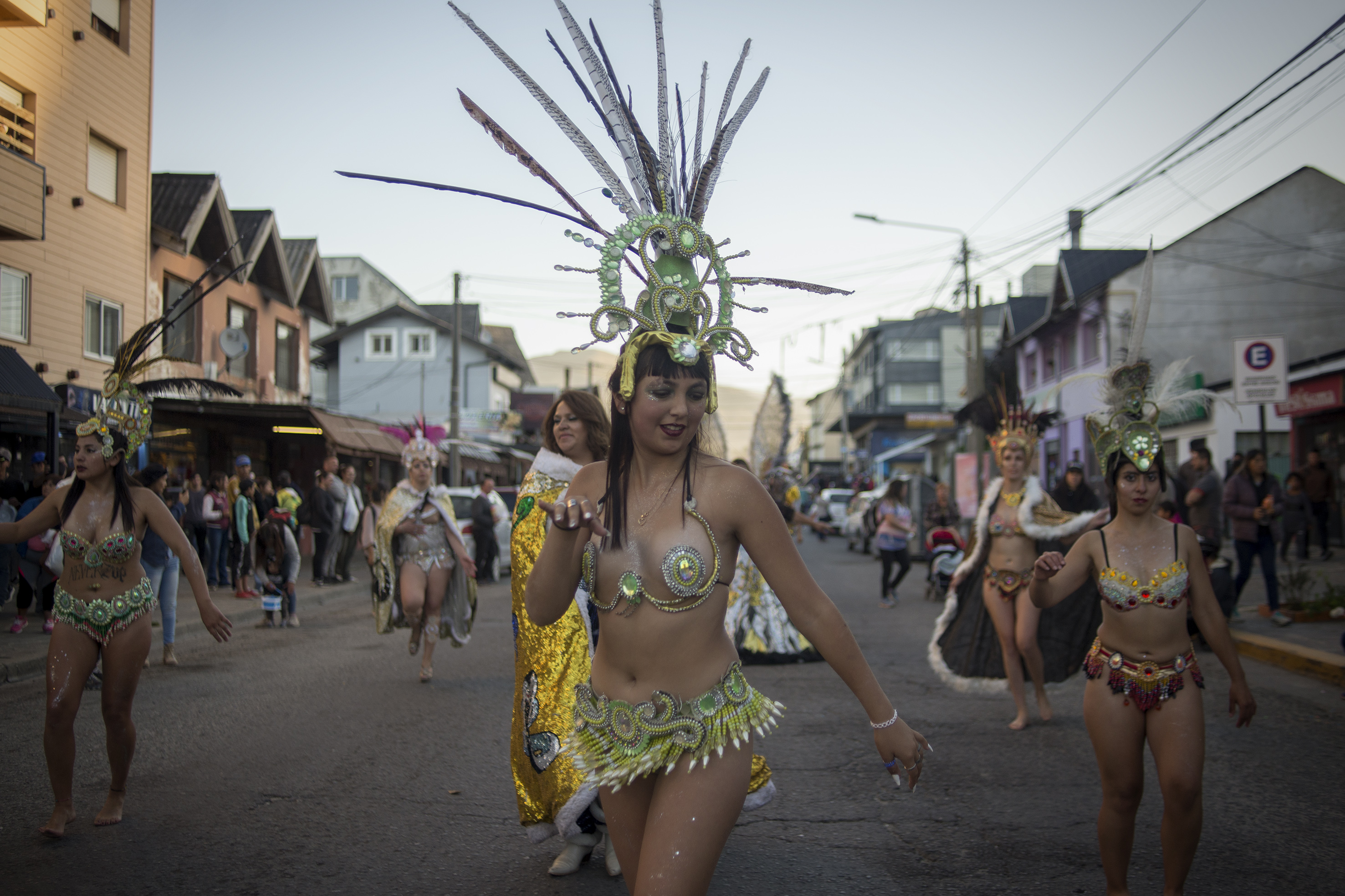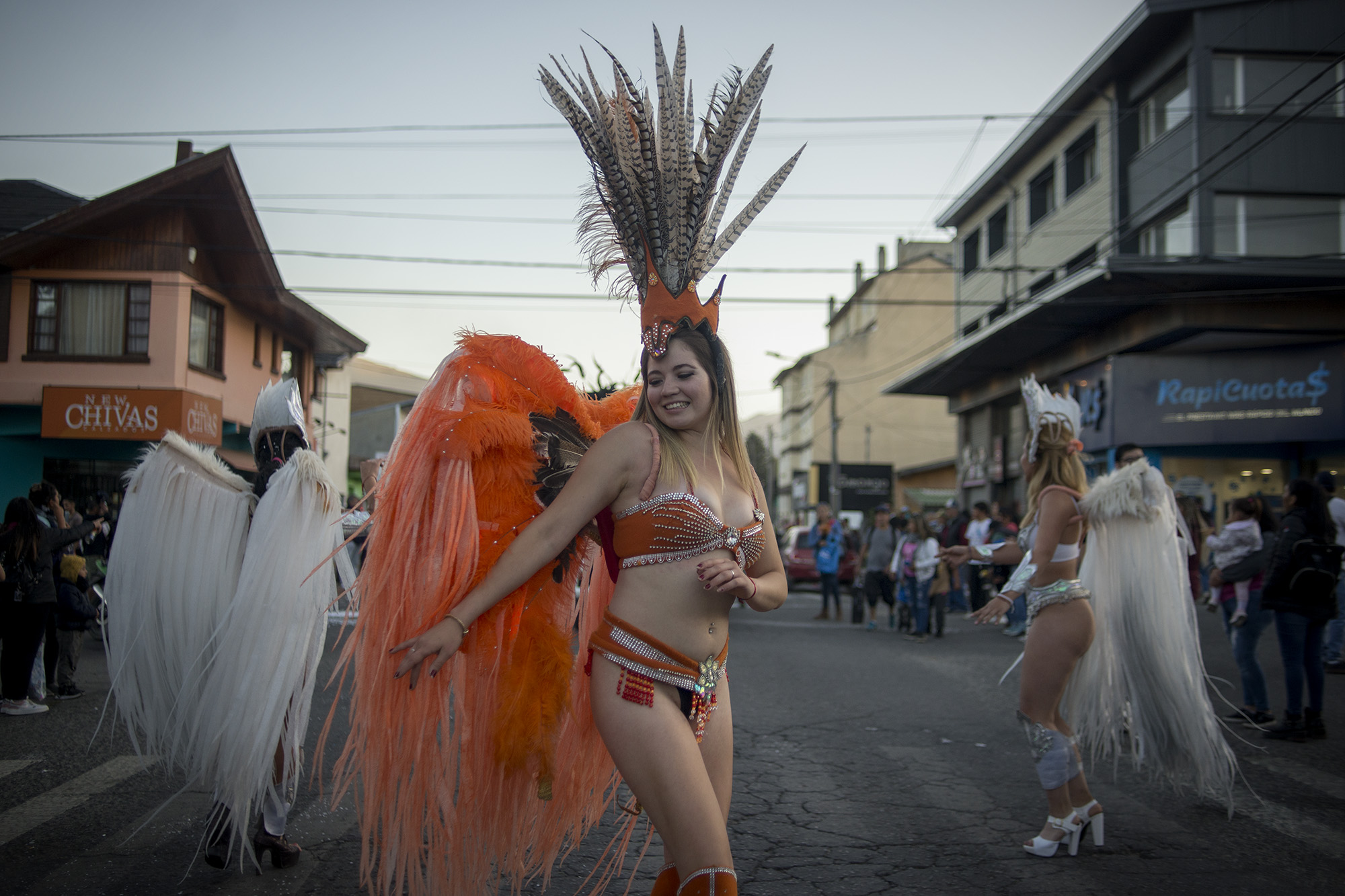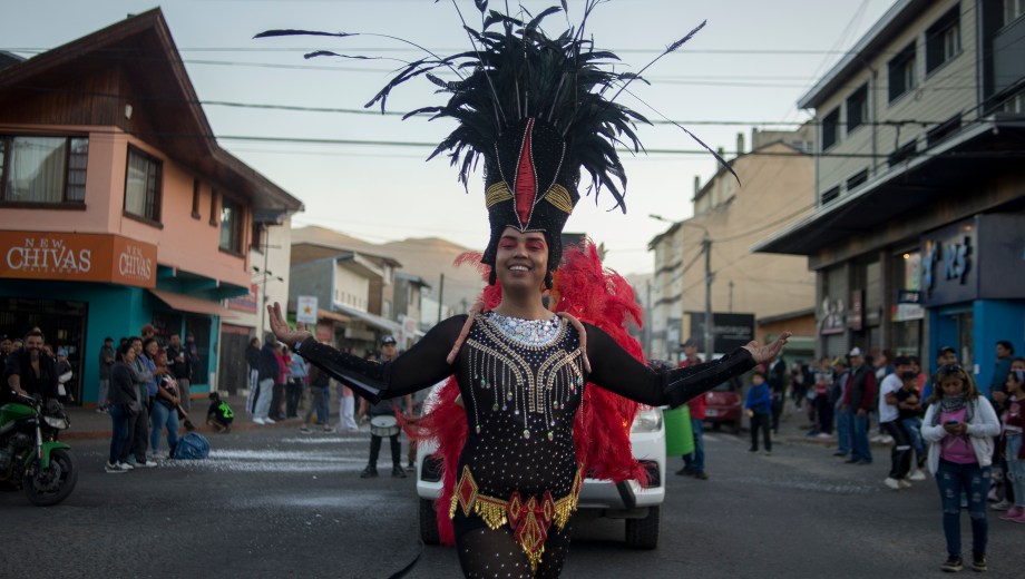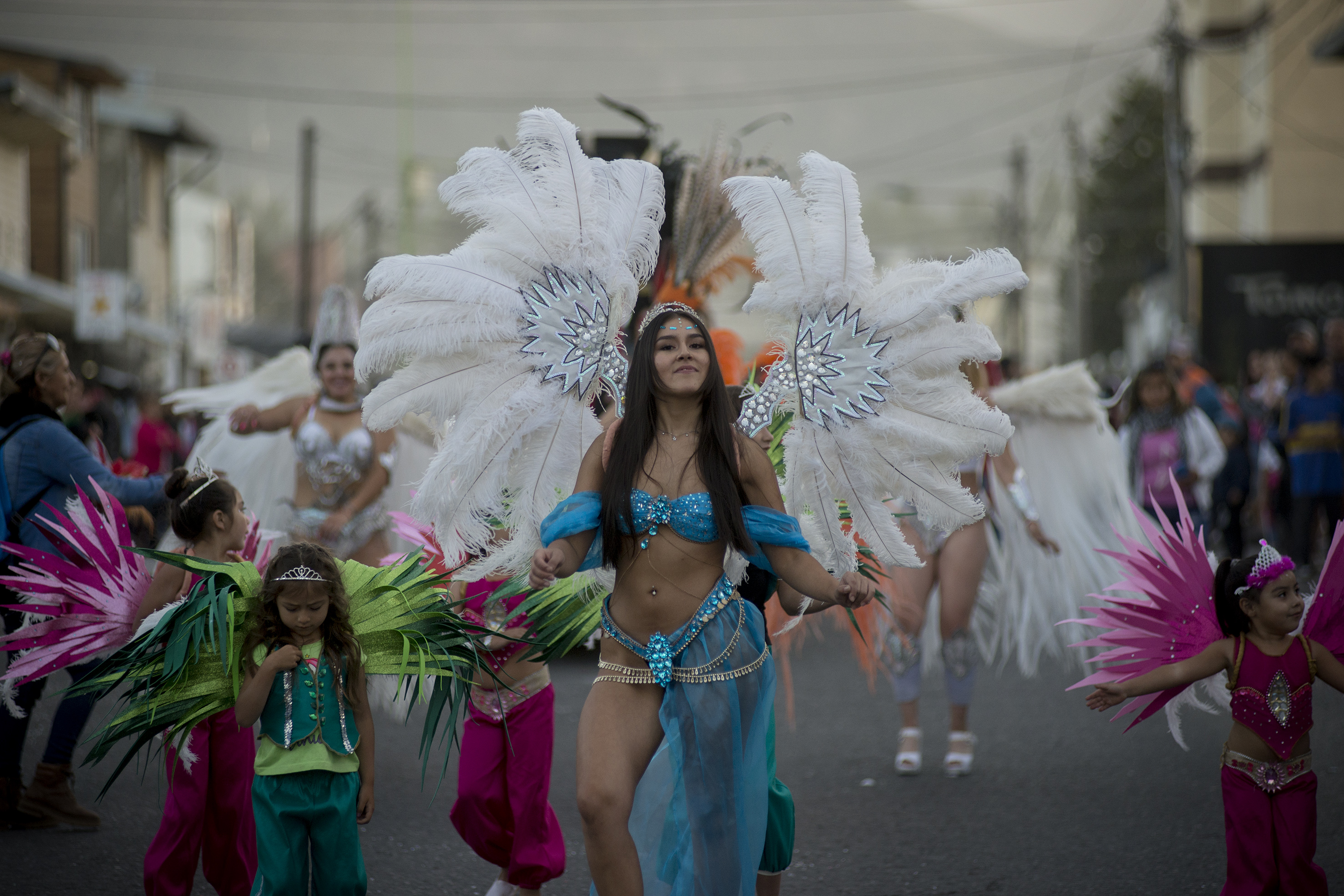 La comparsa Alfa puso mucho esmero en los trajes de sus bailarinas, desde las más pequeñas hasta las adultas, que precalentaron en la calle 25 de Mayo con sus pasos cargadas de lentejuelas, plumas, brillos, soportes de espaldas, en la previa a dar apertura, junto a otras agrupaciones, al carnaval popular de Bariloche.