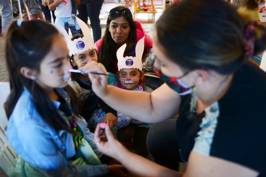 En otra de las carpas había jóvenes expertas en “maquillaje artístico” que pintaban la cara de los voluntarios. Como en todas las “estaciones”, los chicos podían cosechar allí un nuevo sello en el “pasaporte” para canjearlo al final del recorrido por su diploma de la “universidad del chocolate”.