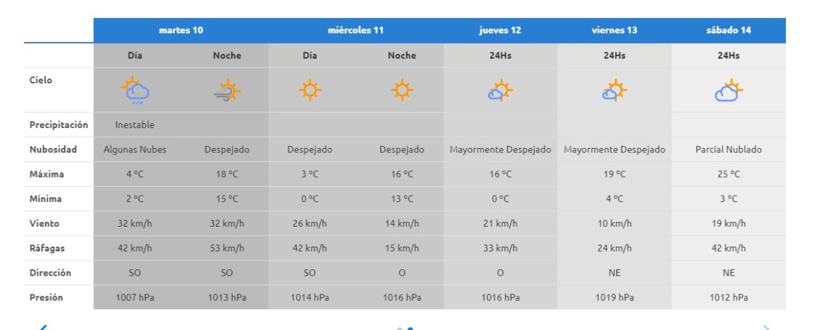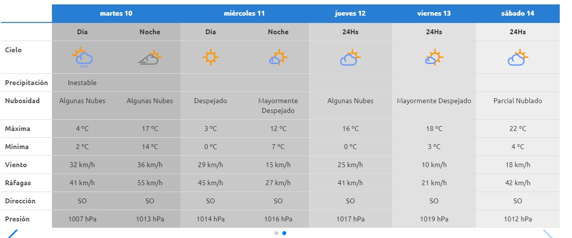 Para el martes, la inestabilidad se irá debilitando, habrá cielo despejado hacia el miércoles pero con temperaturas bajas. Recién el jueves levanta el termómetro a 16 grados, irá en aumento hacia el viernes y el sábado con una máxima que podría llegar a los 22 grados.